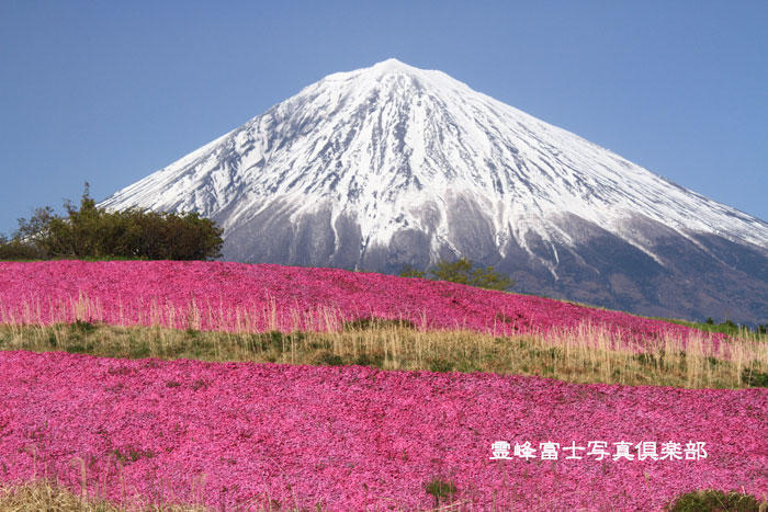 I Japan är den vackra blomväxten mossflox (Phlox subulata) vanlig i parker. När den slår ut i blom målas hela marken i rosa toner. Här är en park nära den aktiva vulkanen Fuji.