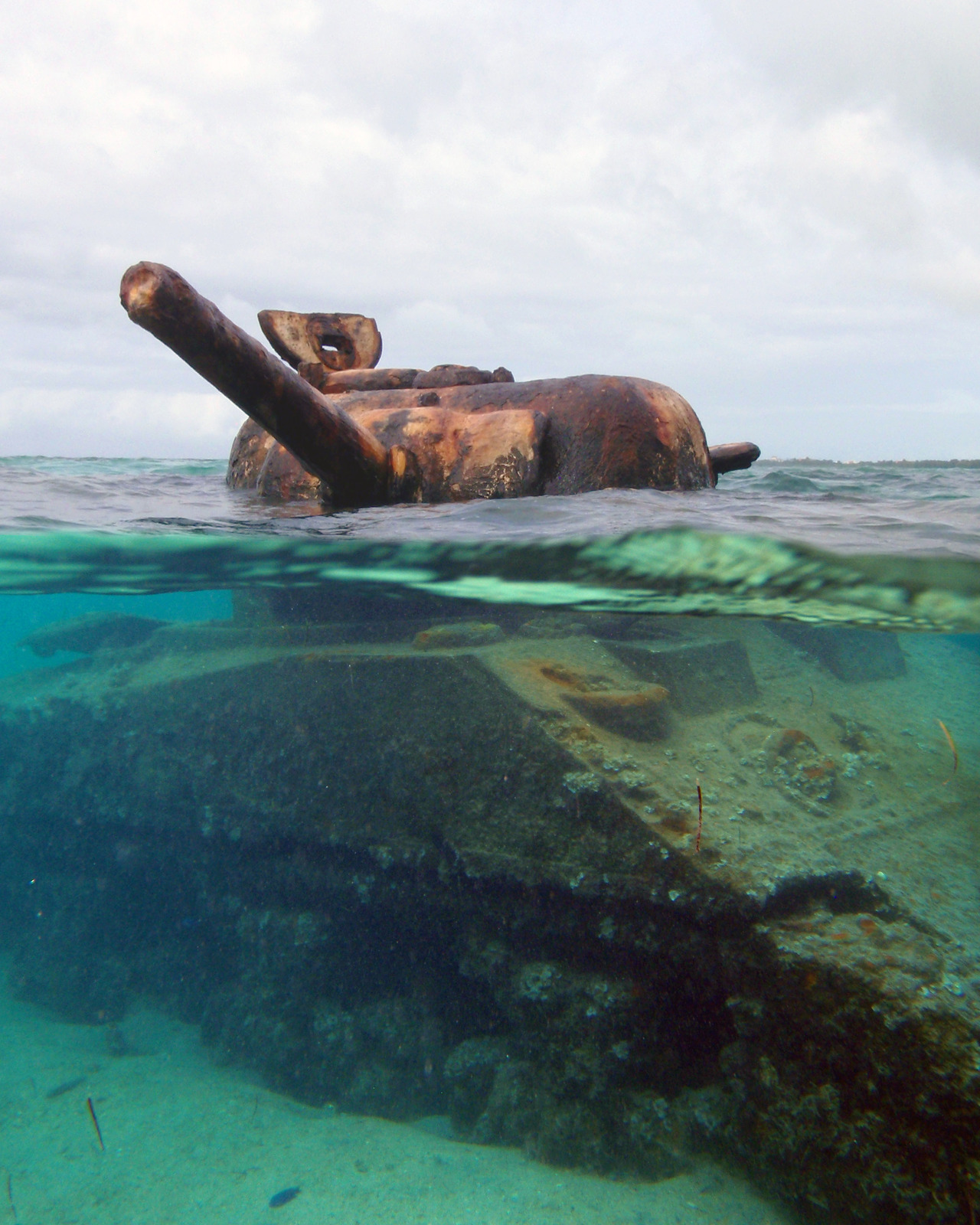 Söderhavsön Saipan var platsen för ett av de blodigaste slagen under andra världskriget. Idag badar turister bland vrak som oavsiktligt blev kvar som påminnelser över det fruktansvärda kriget. Övre bilden visar en amerikansk Shermanstridsvagn och den undre ett amerikanskt landstigningsfordon. (x)