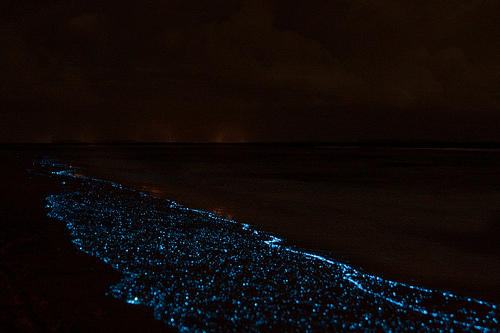 Bioluminiscens är ett helt naturligt fenomen där levande organismer utsänder ljus. Många organismer i havet har denna förmåga, bland annat dessa fytoplankton på en strand på Maldiverna.
