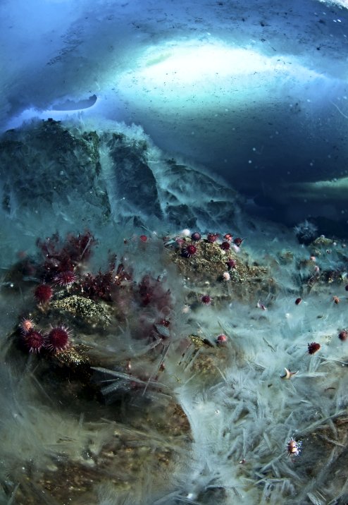 Detta är en isstalaktit - en vacker men dödlig istapp i havet. När havsvatten börjar frysa pressas salt ur den nybildade isen. Detta leder till små tunnlar genom istäcket med supersalt, underkylt och tungt vatten - kallat saltlake - som sipprar ner till vattnet under isen. Där sprider saltlaken sin kyla, vattnet fryser, och istäcket tjocknar underifrån. Ibland bildas dock få och stora saltlakekanaler. När strömmen av saltlake från en sådan kanal når vattnet fryser det endast längs utkanterna av strömmen. Saltlaken fortsätter sjunka neråt och en vacker skorsten av is växer fram. Men skönheten har ett pris. Vid vissa förhållanden når skorstenen ända ner till botten. Där fortsätter saltlaken att sprida kyla och de bottenlevande djur som inte hinner undan fryser fast och dör.